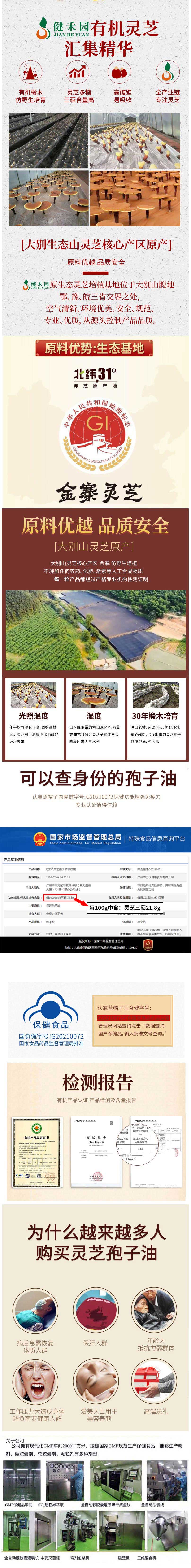 产品说明:健禾园灵芝孢子油采用大别山天然无污染的头道灵芝孢子粉经低温物理破壁、超临界CO2萃取而成,所有工艺均在同一厂房的一条生产线上完成,在产品的生产过程中无污染无氧化,保证了产品的品质。健禾园孢子油内容物为100%灵芝孢子油,不添加任何辅料,灵芝三萜高达21.8%,具有增强人体免疫力的功效。